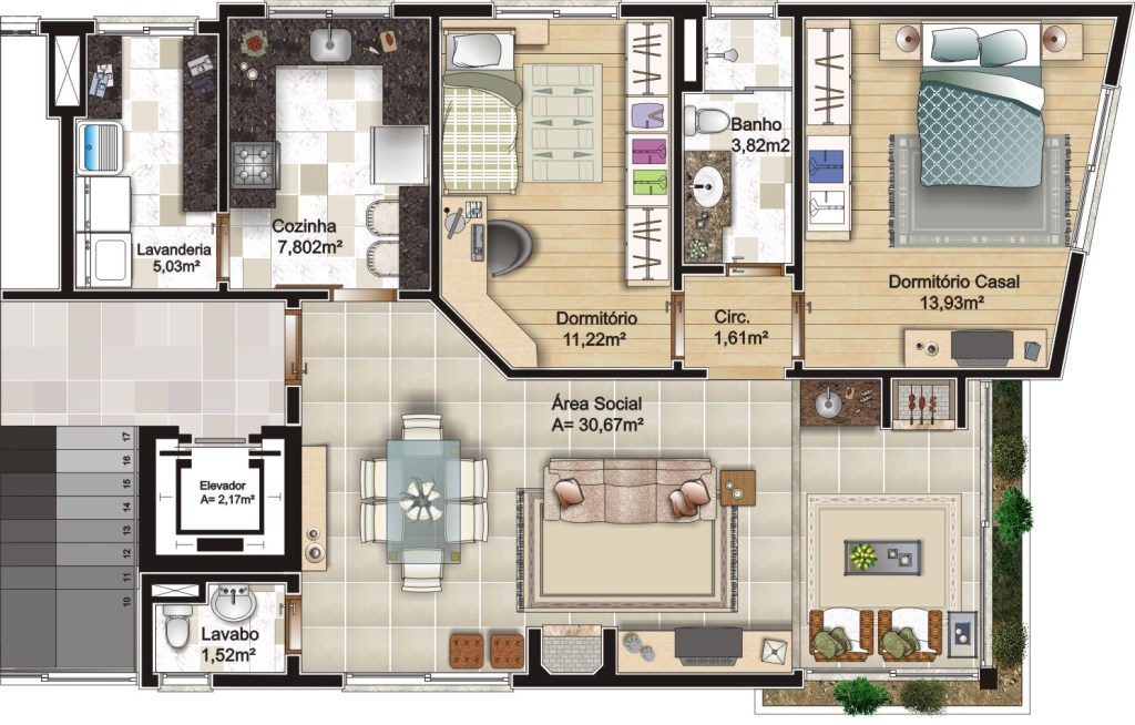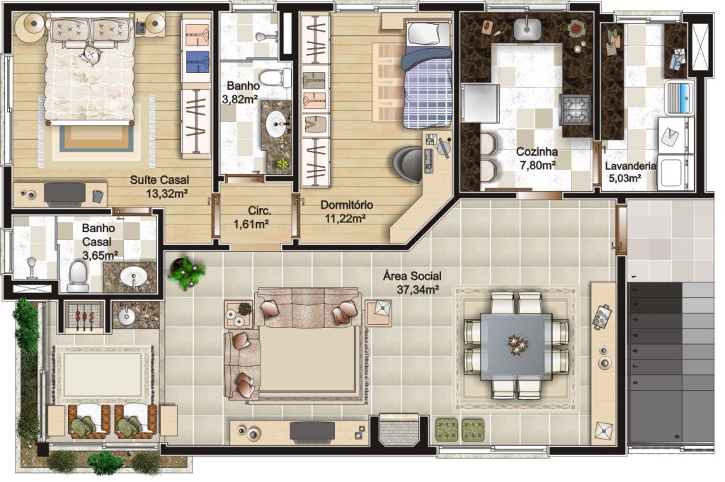 - Apartamentos com 02 dormitórios de 92,03m² com suíte